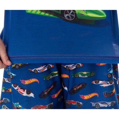 - VIVID COLOR, HIGH-QUALITY PRINTED DESIGNS – The short sleeve top features an awesome front design of 3 hot-rod style toy cars and the script Race Team. The pajama shorts feature a matching allover pattern with dozens of Hot Wheel car designs!!