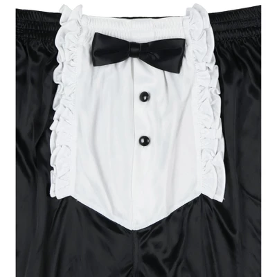 - Dressed-Up Detail: Tuxedo Design with Bow Tie Flair These novelty boxer shorts bring playful style to a classic silhouette with a tuxedo-inspired front panel. The design features a crisp white ruffle print and a printed bow tie right at the waistband, giving the look of formalwear from the front—a fun take on traditional lounge or costume wear.