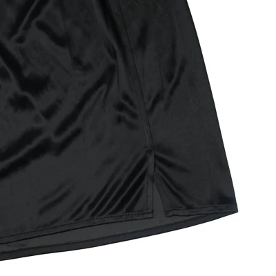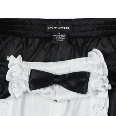 Step into a fun and unexpected twist on everyday loungewear with these men’s black tuxedo-style boxer shorts. The front features a white ruffle design with a bow tie across the waistband, giving the illusion of formal attire in a comfortable and flexible boxer shorts cut. The soft polyester fabric feels smooth against the skin, with a 1-inch elastic waistband, stretch thigh slits, and a 2-button fly closure adding both comfort and structure.Whether you’re lounging at home or creating a playful outfit, these silky boxer shorts balance novelty and function. The hand-wash-only fabric helps preserve the tuxedo detailing, while the tailored fit offers ease of movement. With a lightweight, breathable design and standout look, they fit right into themed wardrobes, cosplay dress-ups, or casual evenings where comfort meets character.