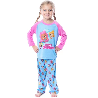 - CLASSIC CHARACTER DESIGN – This Bubble Guppies pajama-top features Molly, Oona, and Deema singing with the phrase “Let’s Dance” under them. The pajama pants feature an all-over print of the three.
