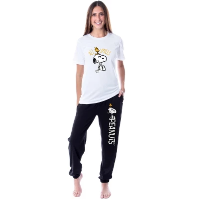 - DETAILED THEME – This Peanuts set-top features the two iconic characters known as Snoopy and Woodstock hanging out, with the words “All Smiles” above them. The jogger pajama pants feature them again, along with the Peanuts logo running down the leg.