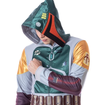 - FEATURES – This union suit features two hand deep pockets perfect for storing all your Star Wars merchandise in! It also has a zip-up front for easy accessibility and a character hood with Boba Fett’s helmet design.