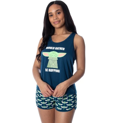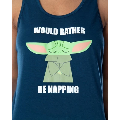 - WONDERFUL BABY YODA CHARACTER DESIGN AND SAYING – This 2 pc pajama set features a racerback muscle tank top and shorts. The top has a large The tank top features a large front design of Baby Yoda with the saying Would Rather Be Napping! Wouldn’t We all sometimes?! The bottoms feature a cute allover Baby Yoda and frog design and have a stretchy waistband with Star Wars script all around.