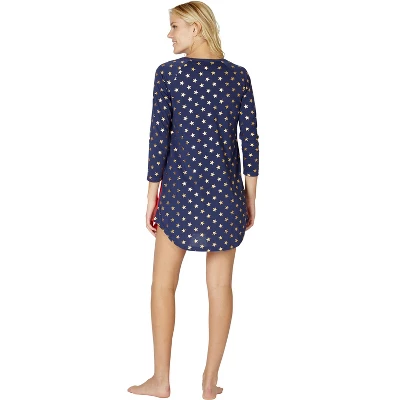 Wonder Woman is one of DC Comics most iconic characters and she stands for Love, peace, and above all else, truth! This PJ has a 3/4 length sleeve in a raglan style nightgown with high/low bottom. The sleeves and back of the nightgown are a navy blue with a gold foil star all over print. The front of the pajama is red with the iconic Wonder Woman Logo in a gold foil print. The trendy design, comfort fit and popular Wonder Woman theme, is perfect for any season. For questions regarding sizing, please refer to size chart.